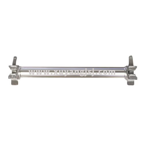 橫桿:材質(zhì)一般采用Q235B,長度可做成0.6M、0.9M、1.2M、1.5M和2.1M,壁厚2.75MM。由插頭、楔形銷和鋼管組成,橫桿可以扣接在立桿圓盤上。橫桿樣圖如下所示: