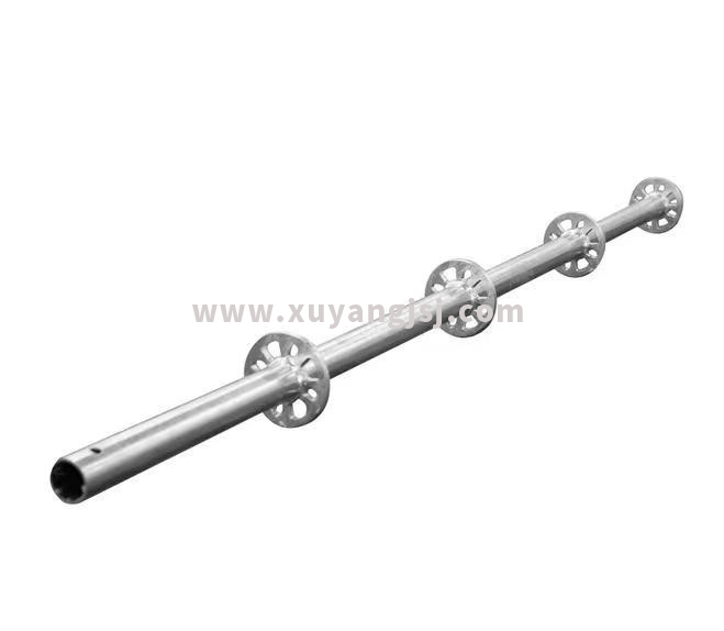 立桿:盤扣式腳手架的主要支撐部件,材質(zhì)一般采用Q355B,最長可做成3M,國內(nèi)通常做成2M居多,壁厚3.25MM。直徑48和60MM的鋼管上每隔0.5M焊有可扣接8個(gè)方向接頭的圓形連接盤,立桿一端焊有立桿連接套筒或者內(nèi)部連接棒,用以垂直方向的立桿接高。立桿樣圖如下所示: